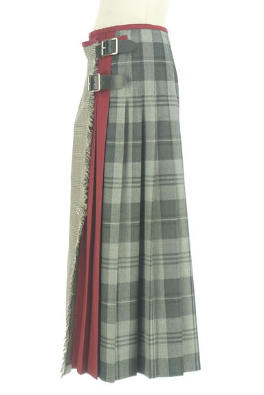 説明前後種類の違うチェック柄に、ボルドーがアクセントになったロングラップスカート。女性らしい巻きスカートに、ウエスト両サイドのレザーのベルトが辛口な印象をプラスします。ピン付き。