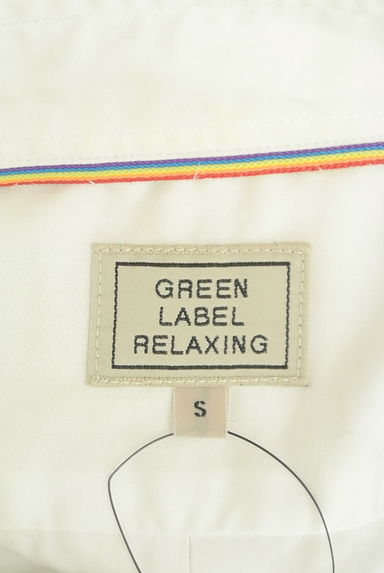 説明左胸の眼鏡刺繍のワンポイント。カラフルなフロントボタンホール刺繍がポップなgreen label relaxingの白シャツ。シンプルながらも遊び心のあるアイテムです。矢印部分 汚れ。全体に軽い汚れ複数。襟裏、袖口汚れ。ラウンドヘム。